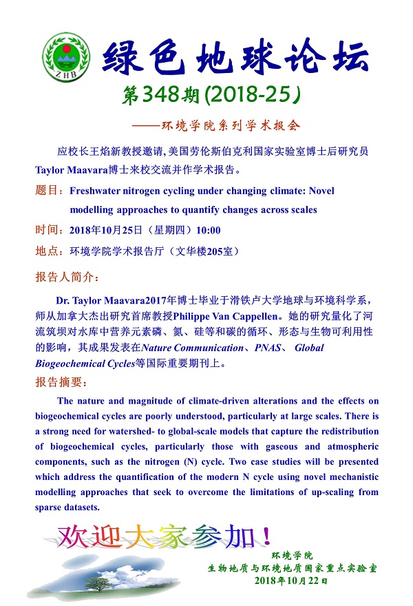 绿色地球论坛第348期(2018-25) ——beat365中文官网系列学术报告会 题目:Freshwater nitrogen cycling under changing climate: Novel modelling approaches to quantify changes across scales 时间:2018年10月25日(周四)上午10:00 地点:beat365中文官网学术报告厅(文华楼205室)