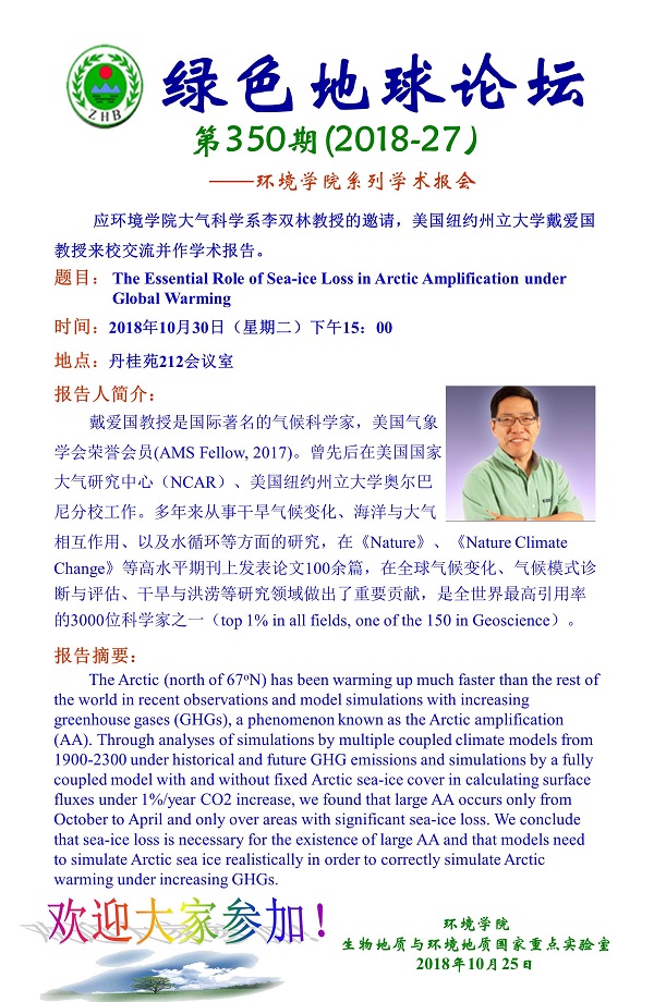 绿色地球论坛第350期(2018-27) ——beat365中文官网系列学术报告会 题目:The Essential Role of Sea-ice Loss in Arctic Amplification under Global Warming 时间:2018年10月30日(周二)下午15:00 地点:丹桂苑212室