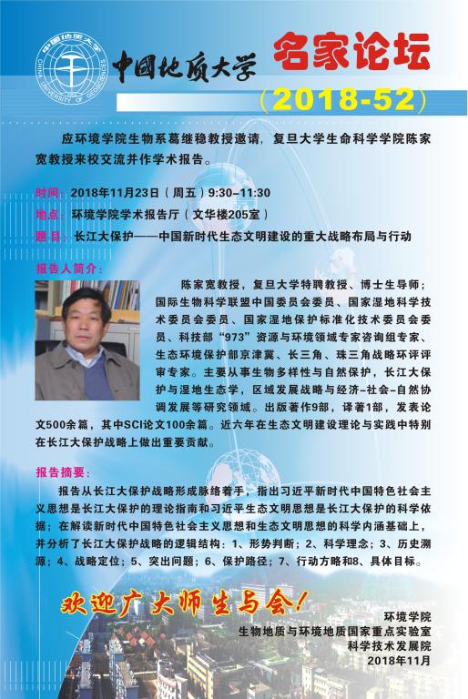 名家论坛(2018-52) 题目:长江大保护——中国新时代生态文明建设的重大战略布局与行动 时间:2018年11月23日(周五)9:30—11:30 地点:beat365中文官网学术报告厅(文华楼205室)