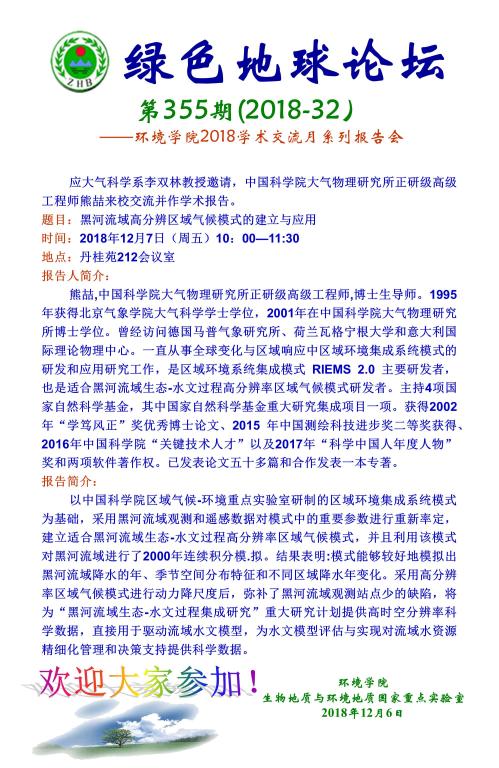 绿色地球论坛第355期(2018-32) ——beat365中文官网2018学术交流月系列报告会 题目:黑河流域高分辨区域气候模式的建立与应用 时间:2018年12月7日(周五)10:00—11:30 地点:丹桂苑212会议室