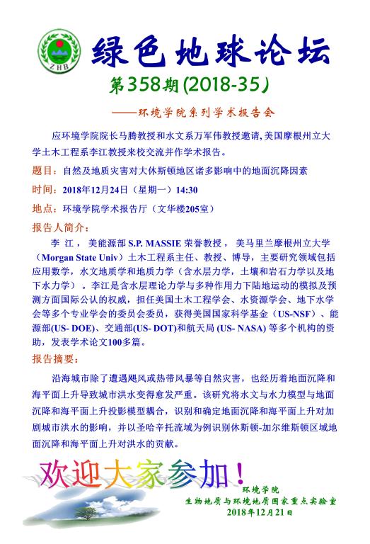绿色地球论坛第358期(2018-35) ——beat365中文官网系列学术报告会 题目:自然及地质灾害对大休斯顿地区诸多影响中的地面沉降因素 时间:2018年12月24日(周一)14:30 地点:beat365中文官网学术报告厅(文华楼205室)