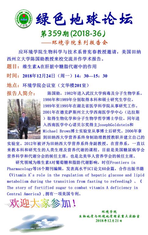 绿色地球论坛第359期(2018-36) ——beat365中文官网系列学术报告会 题目:维生素A在肝脏中糖脂代谢中的作用 时间:2018年12月24日(周一)14:30 地点:beat365中文官网会议室(文华楼201室)