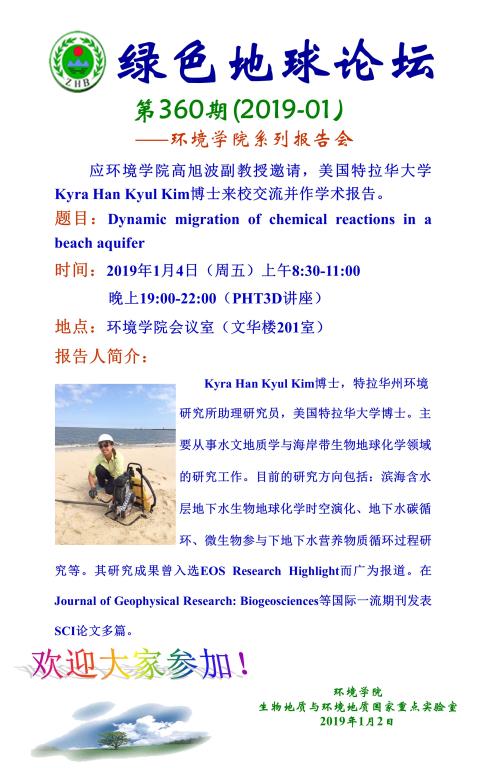 绿色地球论坛第360期(2019-01) ——beat365中文官网系列学术报告会 题目:Dynamic migration of chemical reactions in a beach aquifer 时间:2019年1月4日(周五)8:30—11:00 19:00-22:00(PHT3D讲座) 地点:环境学院会议室(文华楼201室)
