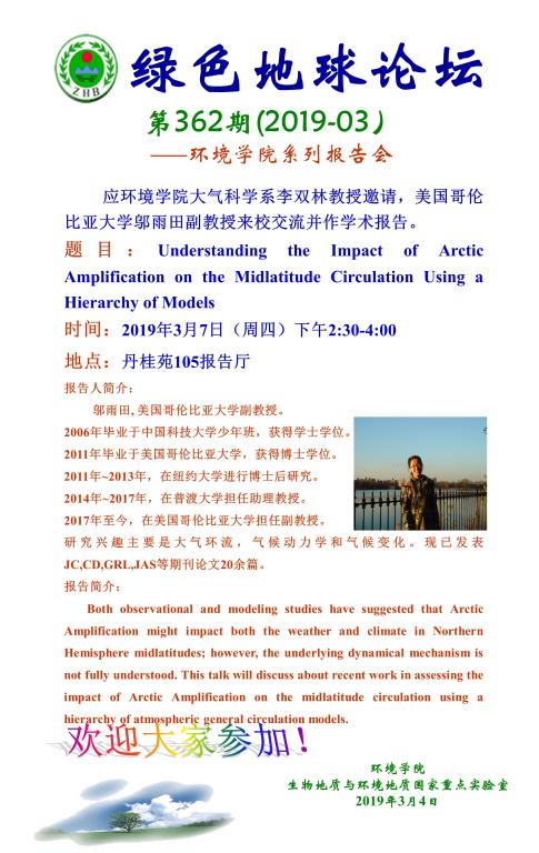 绿色地球论坛第362期(2019-03) ——beat365中文官网系列学术报告会 题目:Understanding the Impact of Arctic Amplification on the Midlatitude Circulation Using a Hierarchy of Models 时间:2019年3月7日(周四)下午2:30-4:00 地点:丹桂苑105报告厅