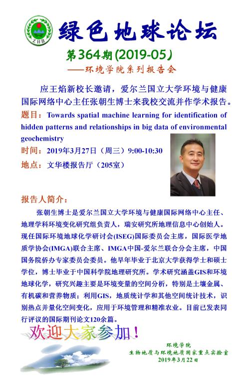 绿色地球论坛第364期(2019-05) ——beat365中文官网系列学术报告会 题目:Towards spatial machine learning for identification of hidden patterns and relationships in big data of environmental geochemistry 时间:2019年3月27日(周三)上午9:00-10:30 地点:文华楼报告厅(205室)