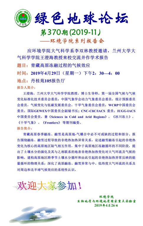 题目:青藏高原冻融过程的气候效应 时间:2019年4月29日(星期一)下午2:30—4:00 地点:丹桂苑105报告厅