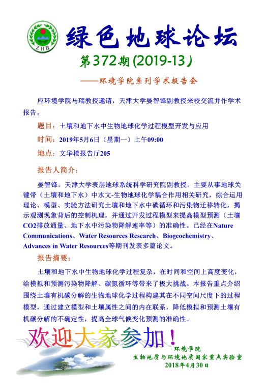 题目:土壤和地下水中生物地球化学过程模型开发与应用 时间:2019年5月6日(星期一)上午09:00 地点:文华楼报告厅205
