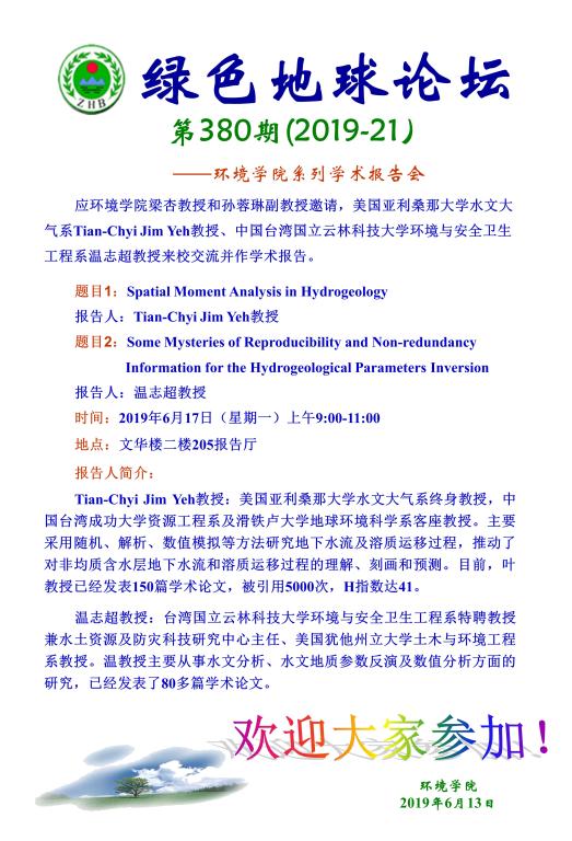 题目: Spatial Moment Analysis in Hydrogeology 报告人:Tian-Chyi Jim Yeh教授 题目: Some Mysteries of Reproducibility and Non-redundancy Information for the Hydrogeological Parameters Inversion 报告人:温志超教授 时间:2019年6月17日(星期一)9:00-11:00 地点: 文华楼二楼205报告厅