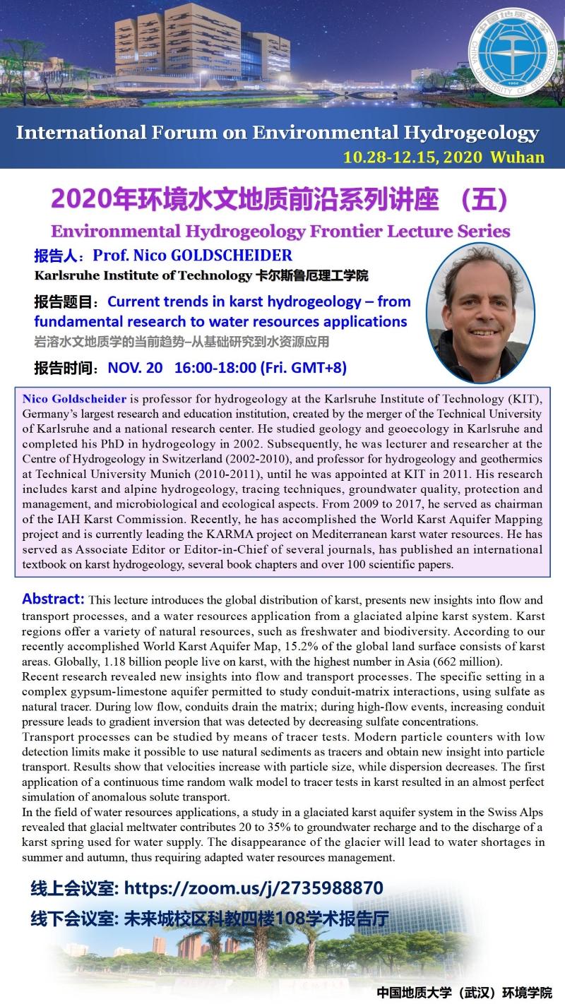 Nico Goldscheider教授,德国卡尔斯鲁厄理工大学应用地球科学研究所所长、水文地质学教授。2002年毕业于德国卡尔斯鲁厄理工大学生物与地球科学系,获自然科学博士学位。自2009年起担任国际水文地质学家协会岩溶水文地质委员会主席,是国际水文地质学家协会地下水和气候变化研究的发起人,主要研究岩溶含水系统的结构与功能、阿尔卑斯地区的岩溶水文地质结构、水文地质中的示踪技术,以及与岩溶地下水相关的生态学与微生物学课题,已发表SCI论文100余篇。