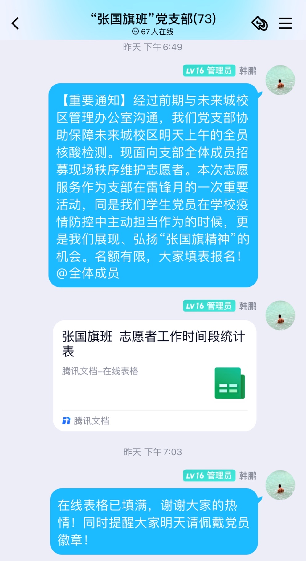 (通讯员王倩、陈鹏飞、韩鹏 摄影边舟悦、覃晓琳、部分图校网 编辑耿婧)党旗举在前,支部冲在前。beat365中文官网“张国旗班”党、团支部获悉3月4日学校进行全员核酸检测这一消息后,第一时间主动请缨,在党委研工部和学院党委的大力支持下、院团委的具体指导下,以志愿服务的形式协助未来城校区管理办公室做好未来城校区全员核酸检测工作。恰逢雷锋精神学习月,“张国旗班”志愿团以“党团联动,致敬雷锋同志”的名义发布志愿者募集通知后,短短片刻,申请人数就远超预定招募人数。