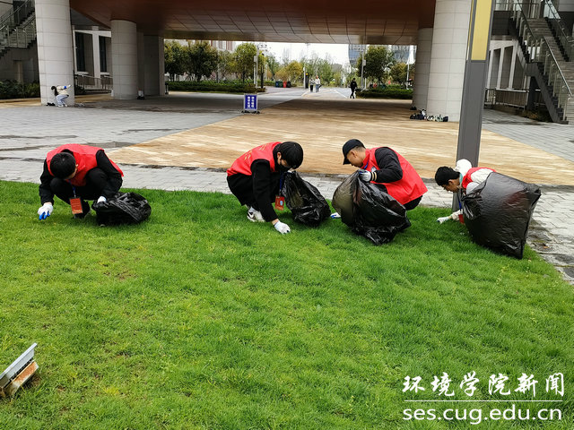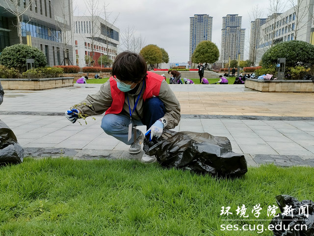 志愿者在beat365中文官网周边绿化带清理杂物